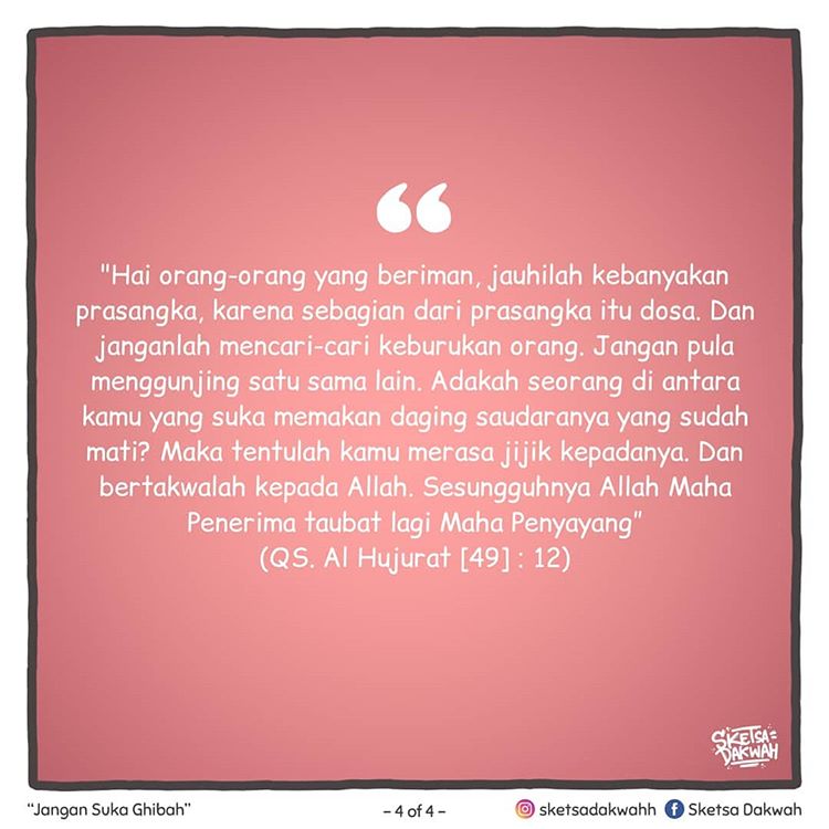 “Hai orang-orang yang beriman, jauhilah kebanyakan berprasangka, karena sesungguhnya sebagian tindakan berprasangka adalah dosa dan janganlah kamu mencari-cari kesalahan orang lain” (Al-Hujurat : 12)